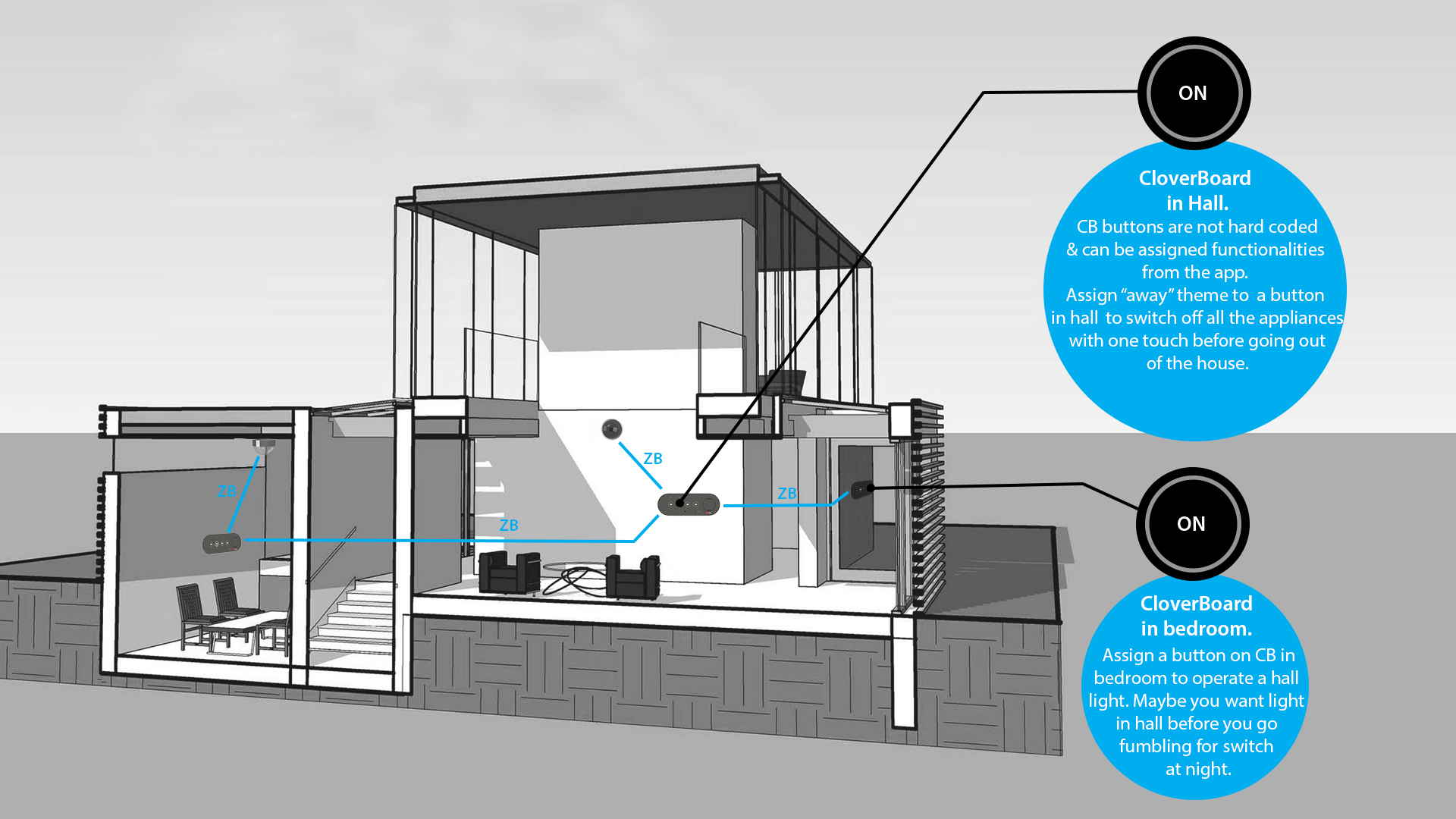All the CloverBoards in a house can talk to each other, and the buttons are not hard coded, which means you can assign functionalities to CloverBoard buttons as per your wish.